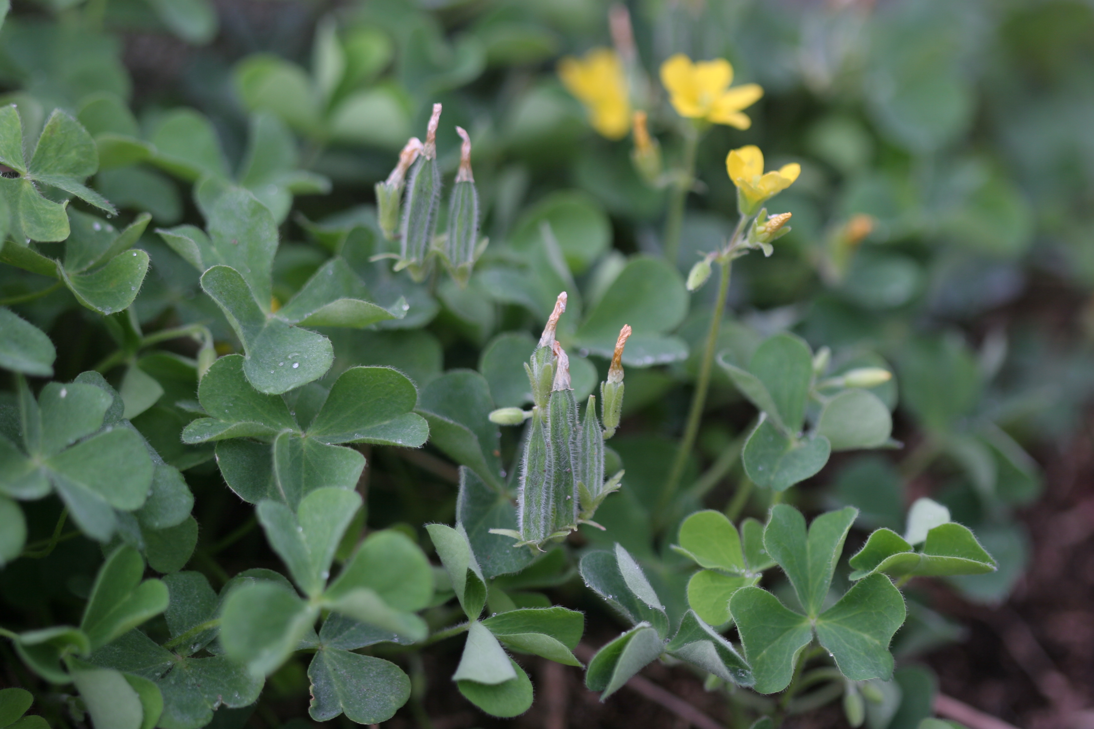 괭이밥은 괭이밥과에 속하는 여러해살이풀입니다. 풀 전체에 가는 털이 나 있는 것이 특징이며, 뿌리는 땅속 깊이 내리고 그 위에서 많은 줄기가 나와 옆으로 또는 위쪽으로 비스듬히 자랍니다. 잎은 줄기에 어긋나게 달리는데, 긴 잎자루 끝에 세 개의 작은 잎이 모여 달리는 세잎(3갈래) 형태입니다.